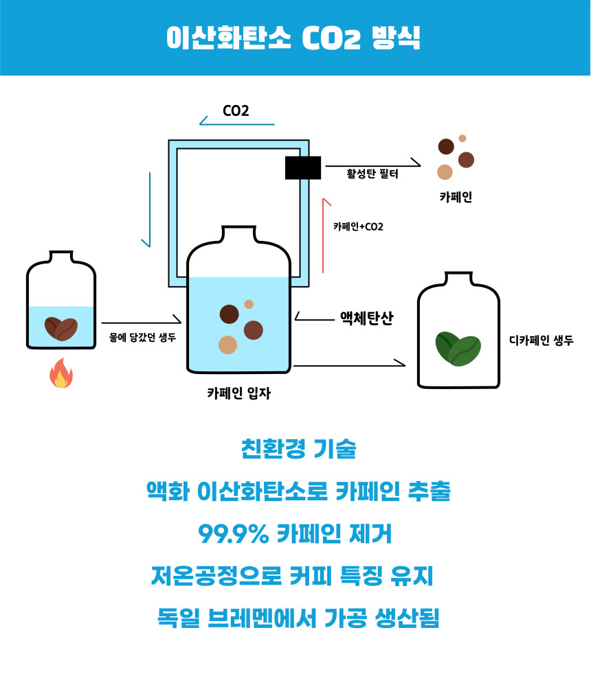 - 액체 탄산으로 카페인 추출 후 활성탄 필터로 카페인만 제거