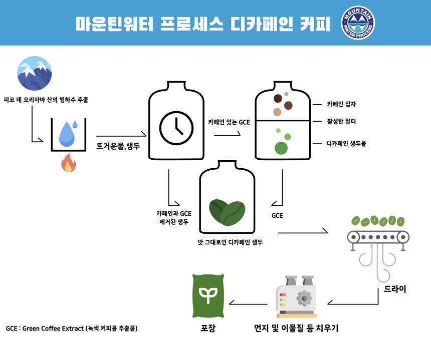 1. 마운틴워터 프로세스(물 이용, 97.66% 카페인 제거)